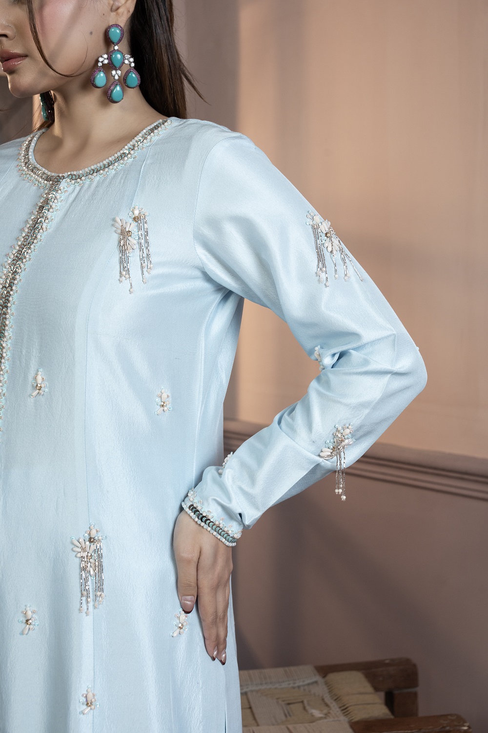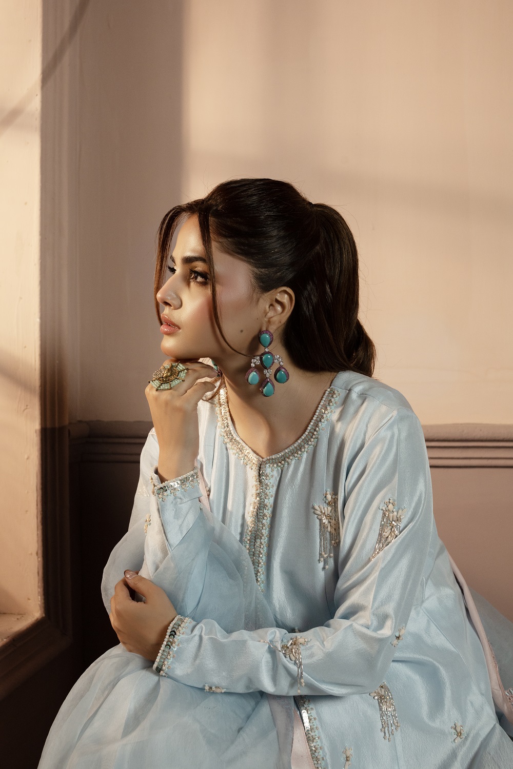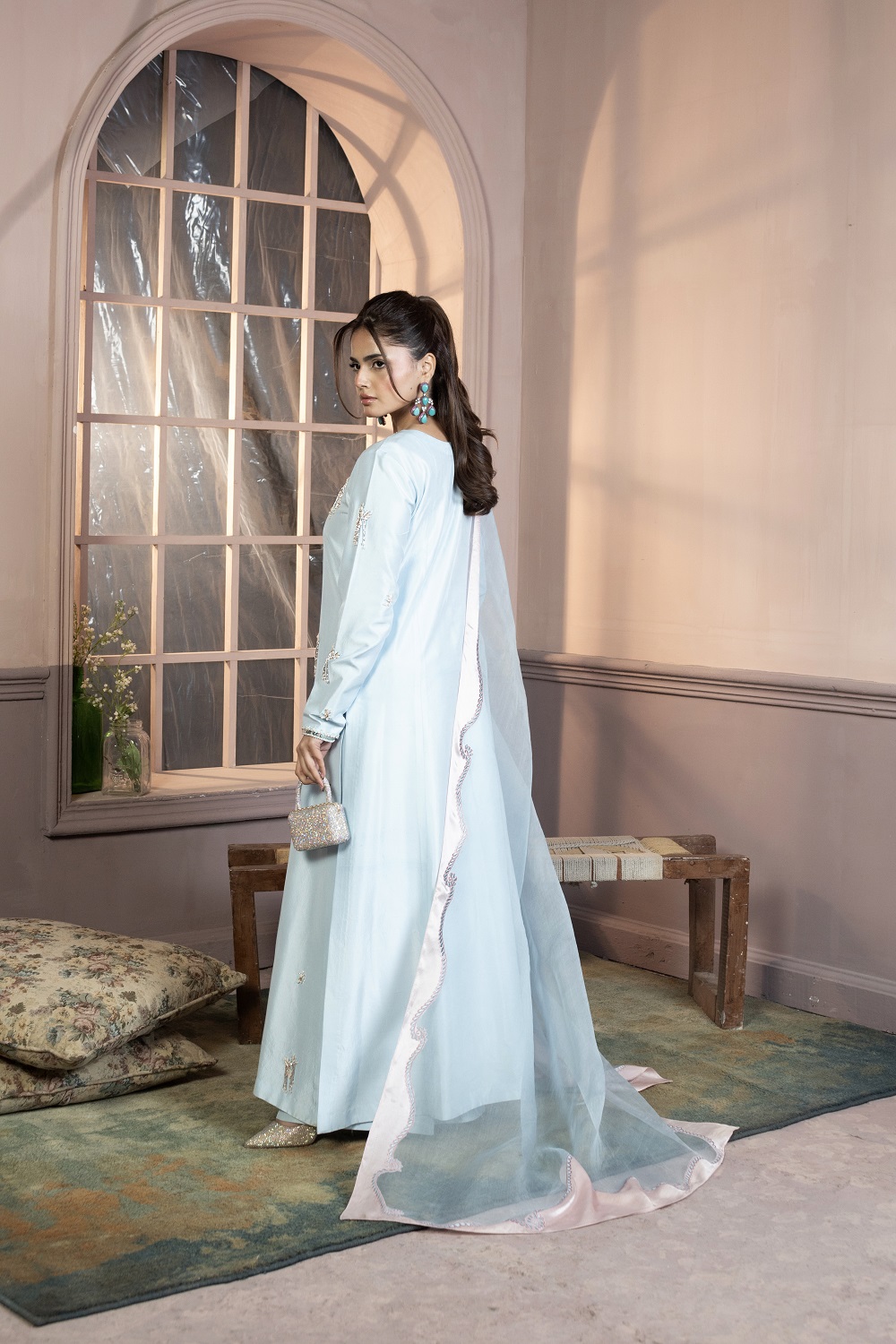 A breathtaking soft ice blue ensemble crafted from pure raw silk, designed in a graceful long front-open silhouette. The front slit is exquisitely hand-crafted with three different sizes of sitaras, adding dimension and subtle sparkle. Intricately handcrafted motifs, adorned with pure crystals, pearls, Swarovski elements, and cutdana with delicate hangings, elevate the artistry. Paired with a pure organza dupatta bordered in soft peachy pink pure shamose silk, enhanced with fine resham embroidery, this piece is the epitome of refined luxury.