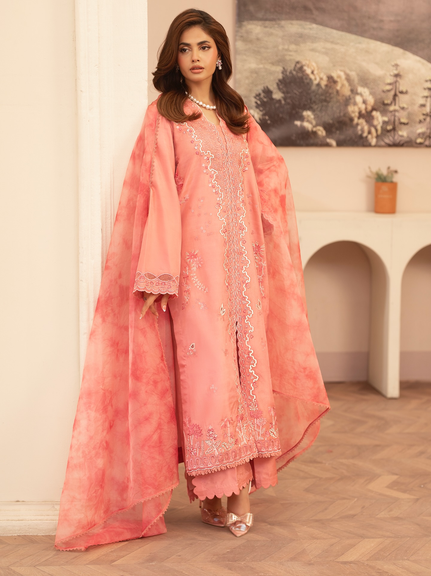 This soft tea pink ensemble is crafted on pure medium silk, offering a graceful fall and refined sheen. The outfit is delicately embroidered in ivory and tonal shades of pink, creating a balanced, romantic look. Paired with a lightweight tie-and-dye organza dupatta, finished with elegant embroidery, the ensemble exudes soft sophistication. The trouser features a mini scalloped cutline, adding a subtle designer touch to complete the look. Perfect for intimate events, festive brunches, or day weddings.Additional information