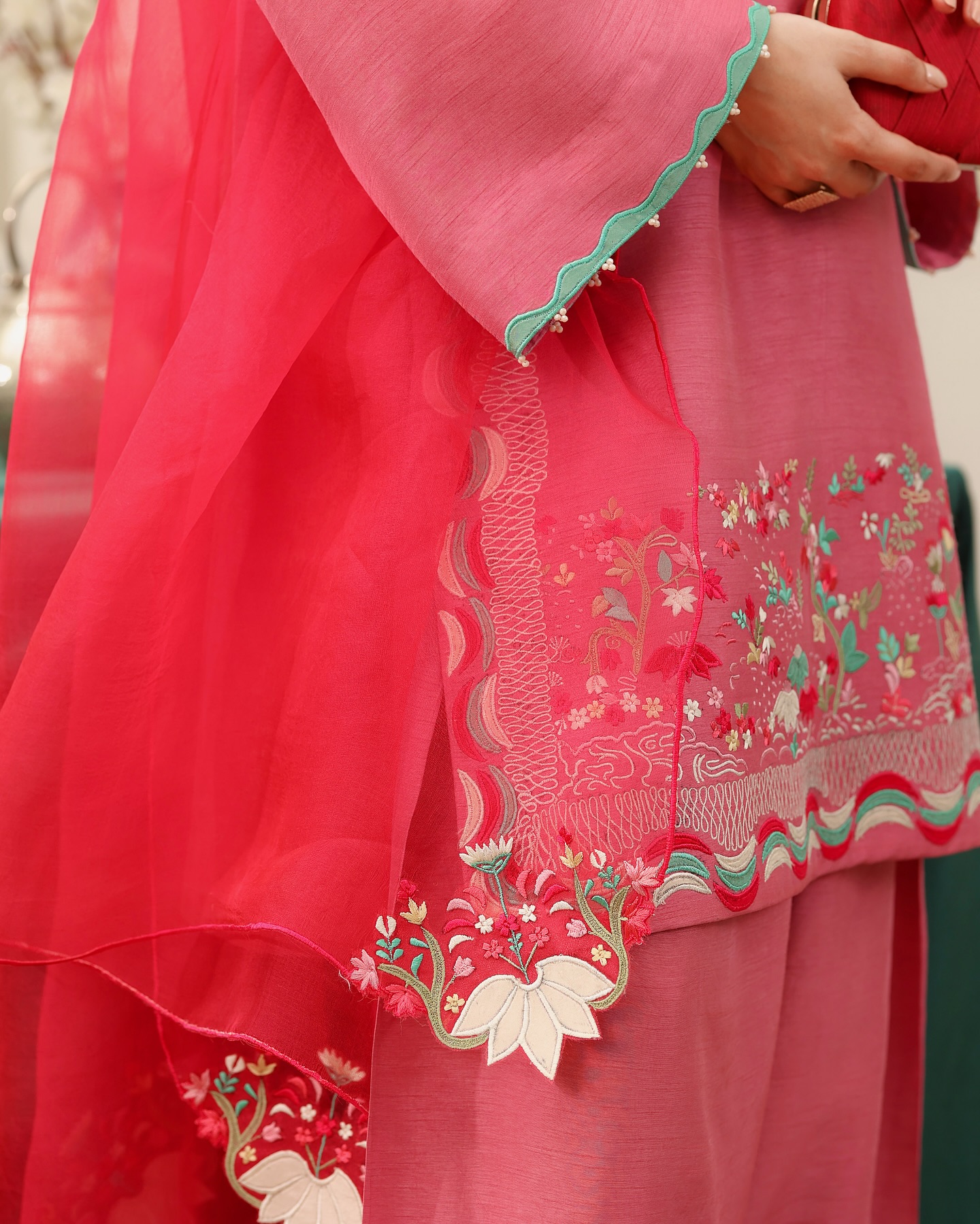 Introducing 𝐂𝐞𝐥𝐞𝐬𝐭- the epitome of modern minimalism. A sleek shalwar kameez adorned with classic hand-embroidered florals, paired with a vibrant dupatta kissed by intricate floral borders.