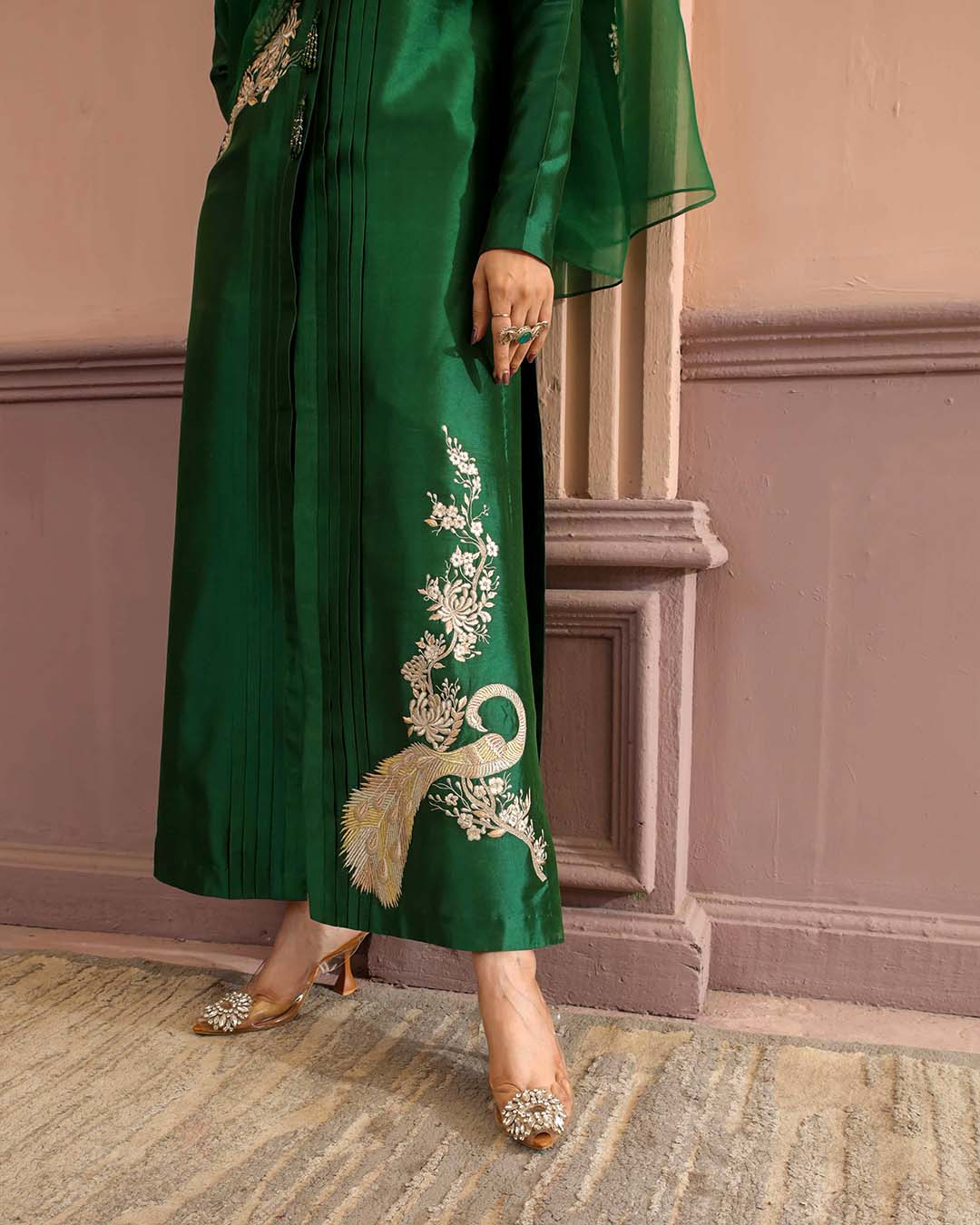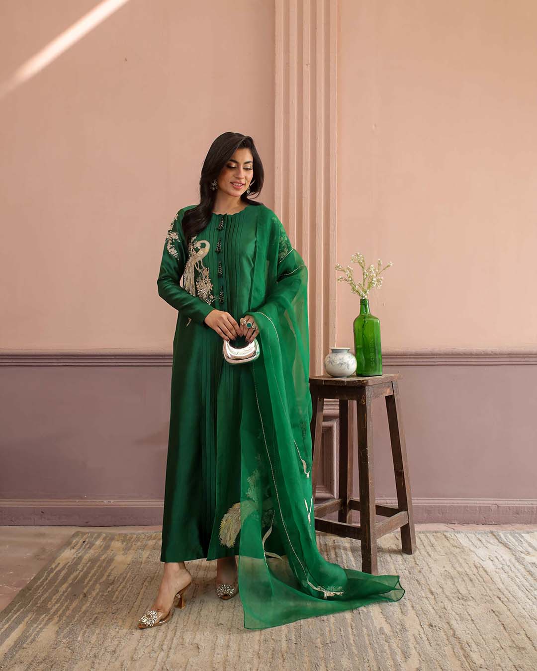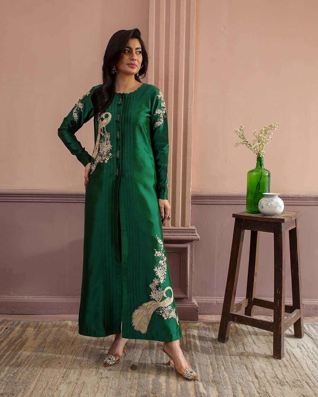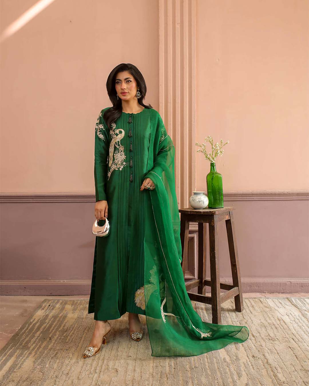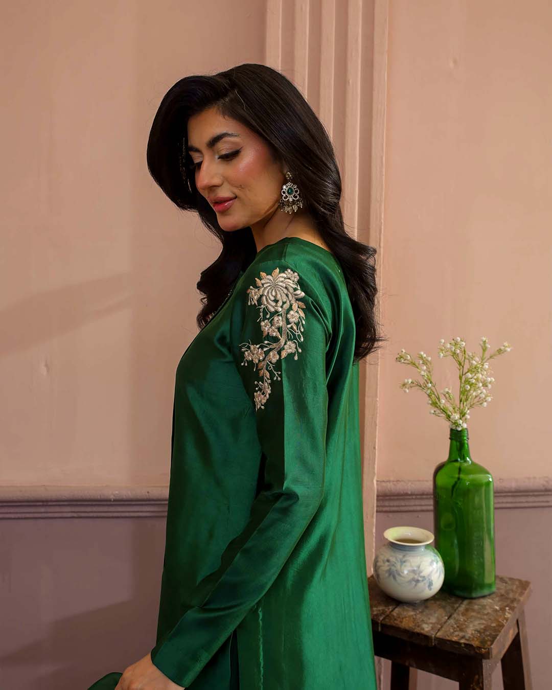 A flowy chiffon dupatta complements the look, featuring tastefully embroidered corner motifs that add subtle charm. The wide-leg trousers are finished with a sequin lace border, creating the perfect balance between sophistication and sparkle.