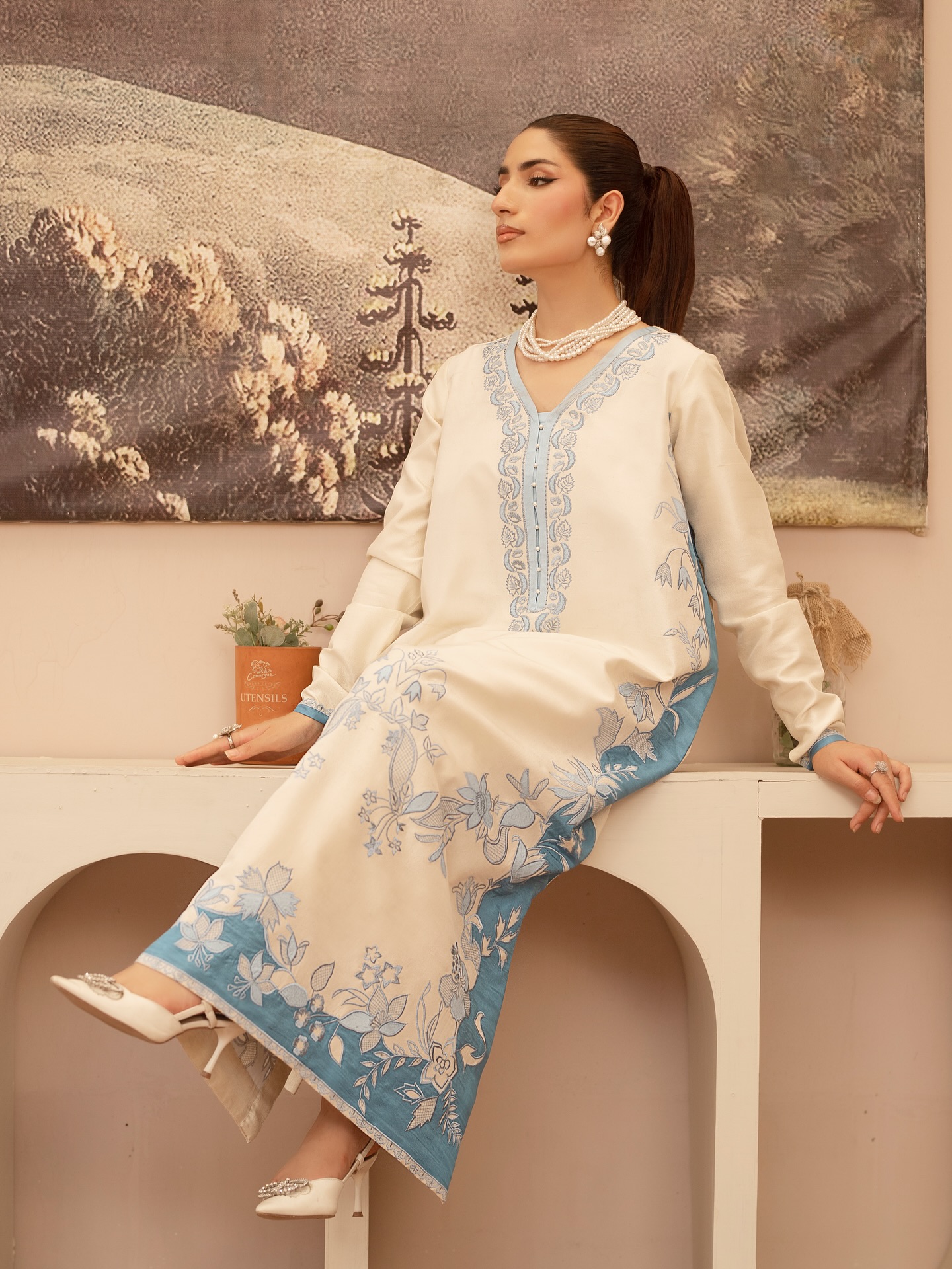Sleeves are adorned with intricate floral embroidery and finished with a two-tone organza scalloped border for added charm. The crinkle chiffon dupatta is delicately detailed with embroidered motif sprays and finished with fine lace, creating a look that’s both regal and refined.