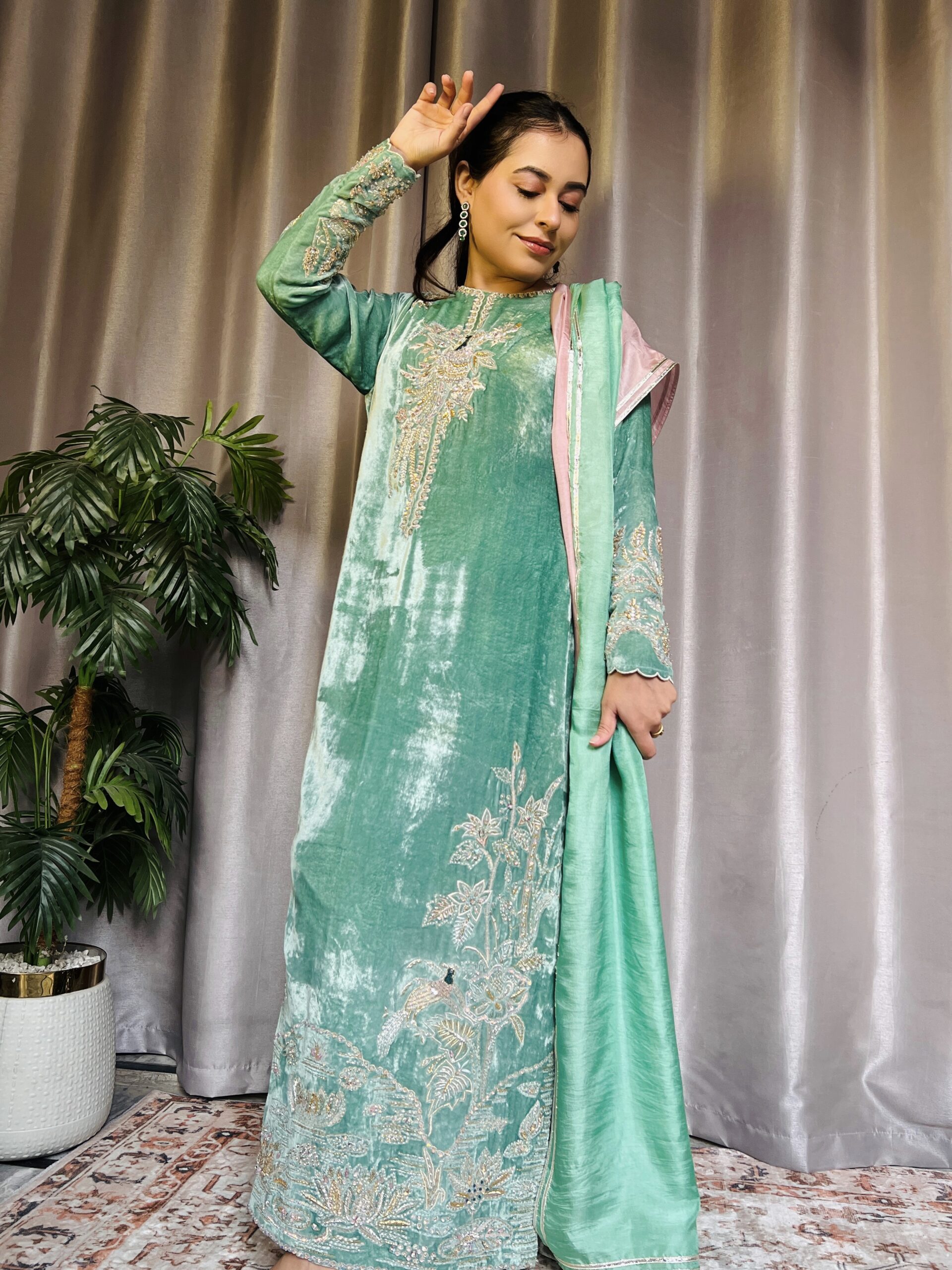 Aqua Sky Tassel Silk Ensemble Immerse yourself in ethereal elegance with this dreamy aqua and sky blue monotone outfit, crafted from pure tassel silk. The front-open shirt is adorned with delicate pastel-hued embroidery, offering a soft, romantic flair. A flowy chiffon dupatta complements the look, featuring tastefully embroidered corner motifs that add subtle charm. The wide-leg trousers are finished with a sequin lace border, creating the perfect balance between sophistication and sparkle. This ensemble is a beautiful blend of pastel serenity and refined detail—perfect for any occasionAdditional information