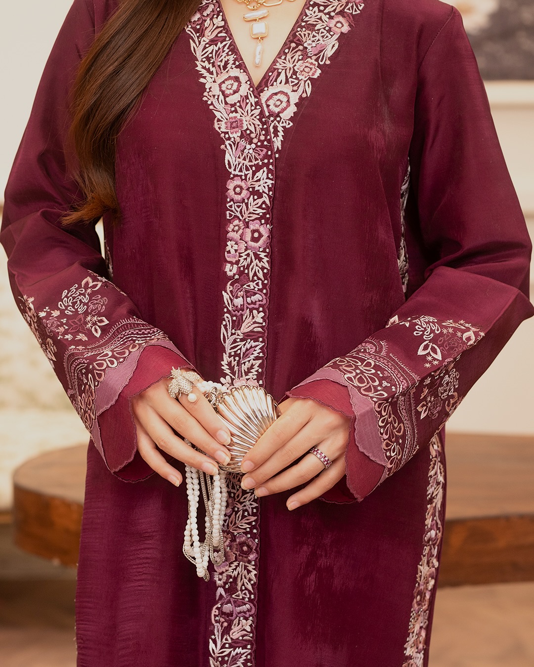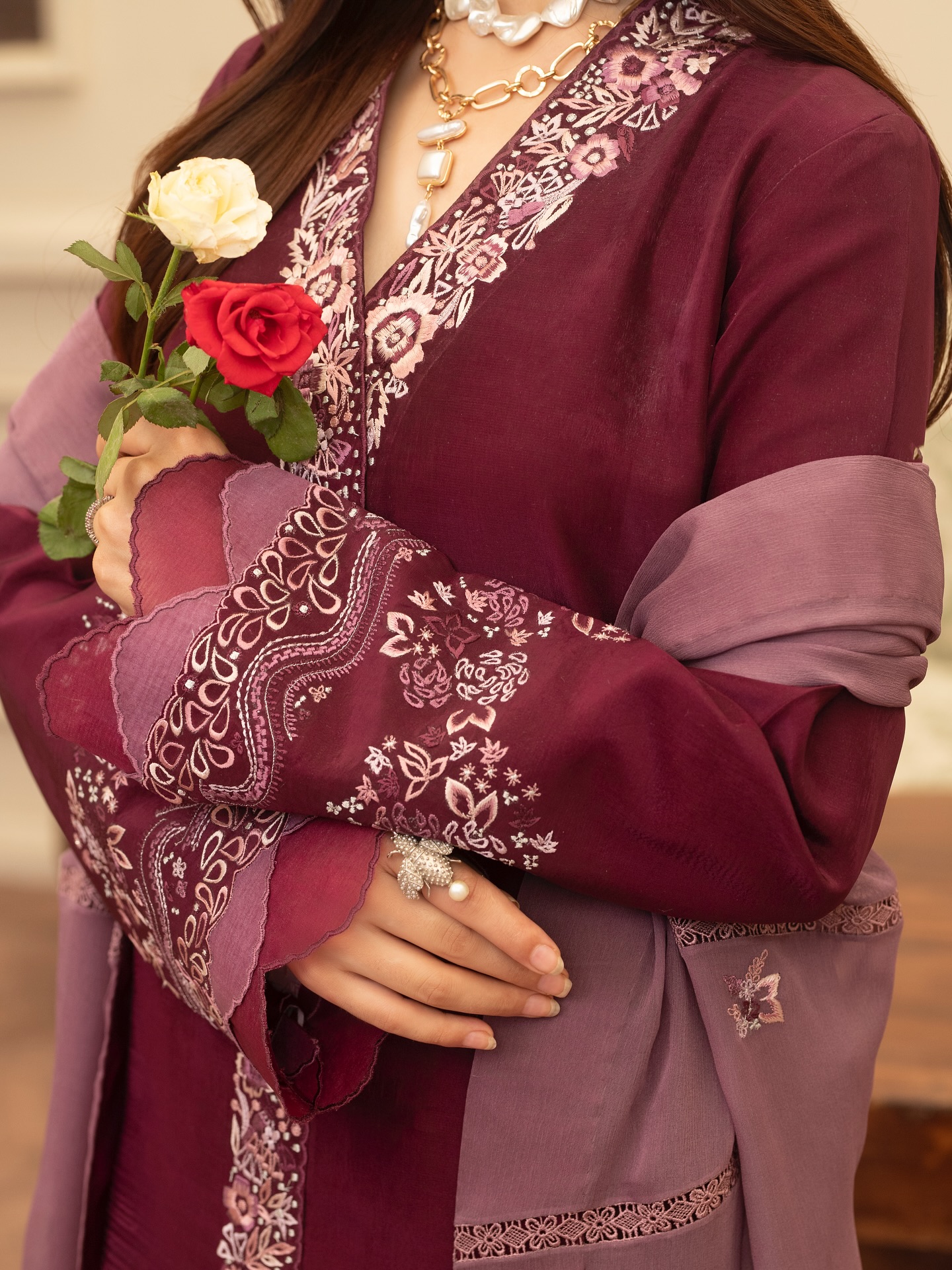 Details This rich dark purple outfit, tailored from pure tassel silk, is a timeless expression of elegance and grace. The shirt features a 2.5-inch wide embroidery panel running down both sides and the center, adding depth and structure to the silhouette. Sleeves are adorned with intricate floral embroidery and finished with a two-tone organza scalloped border for added charm. The crinkle chiffon dupatta is delicately detailed with embroidered motif sprays and finished with fine lace, creating a look that's both regal and refined. Perfect for formal evenings and festive celebrations.Additional information